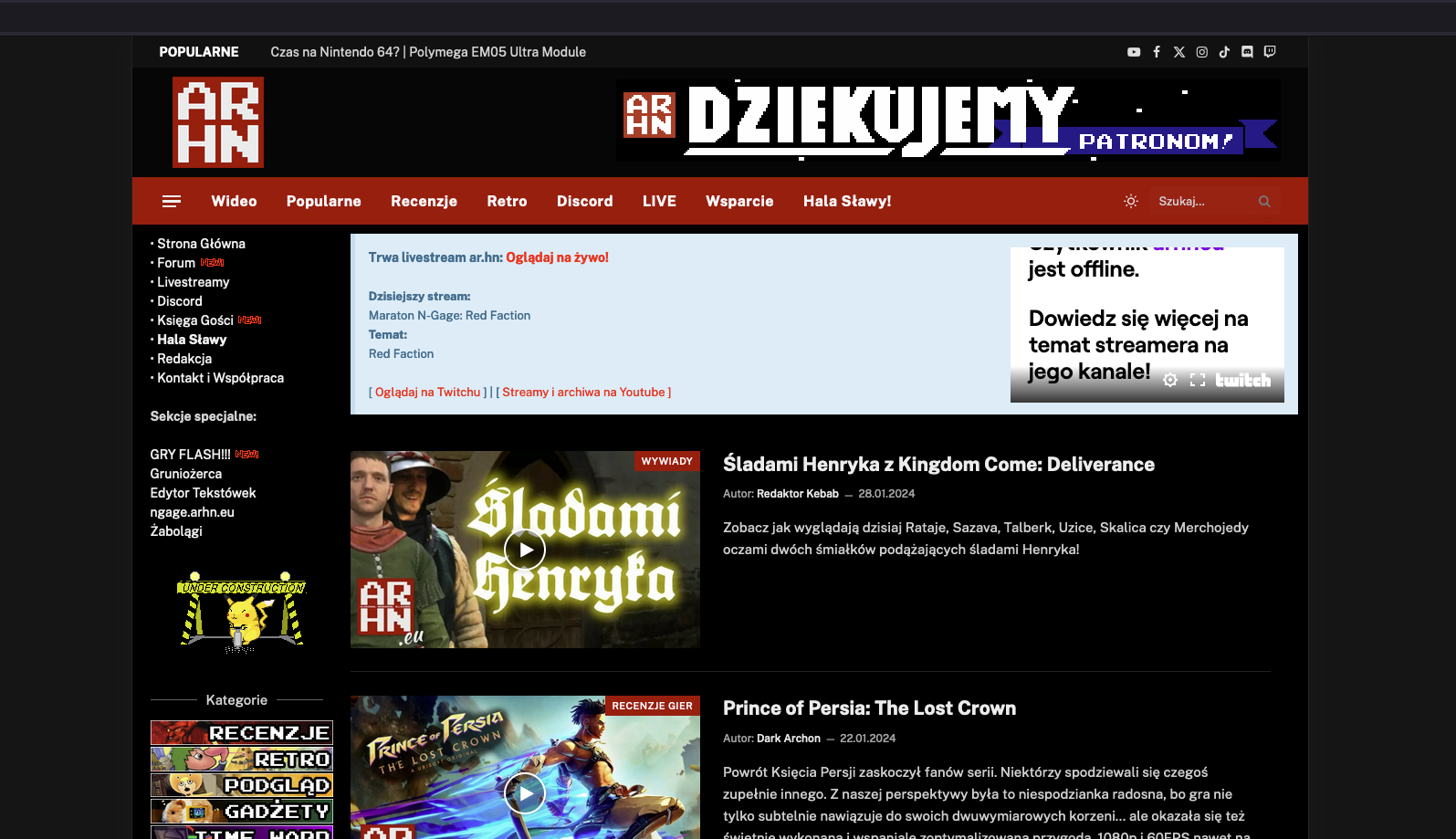 Mimo braku streama, na stronie ar.hn nadal wyświetla się informacja "Trwa livestream ar.hn: Oglądaj na żywo!"
