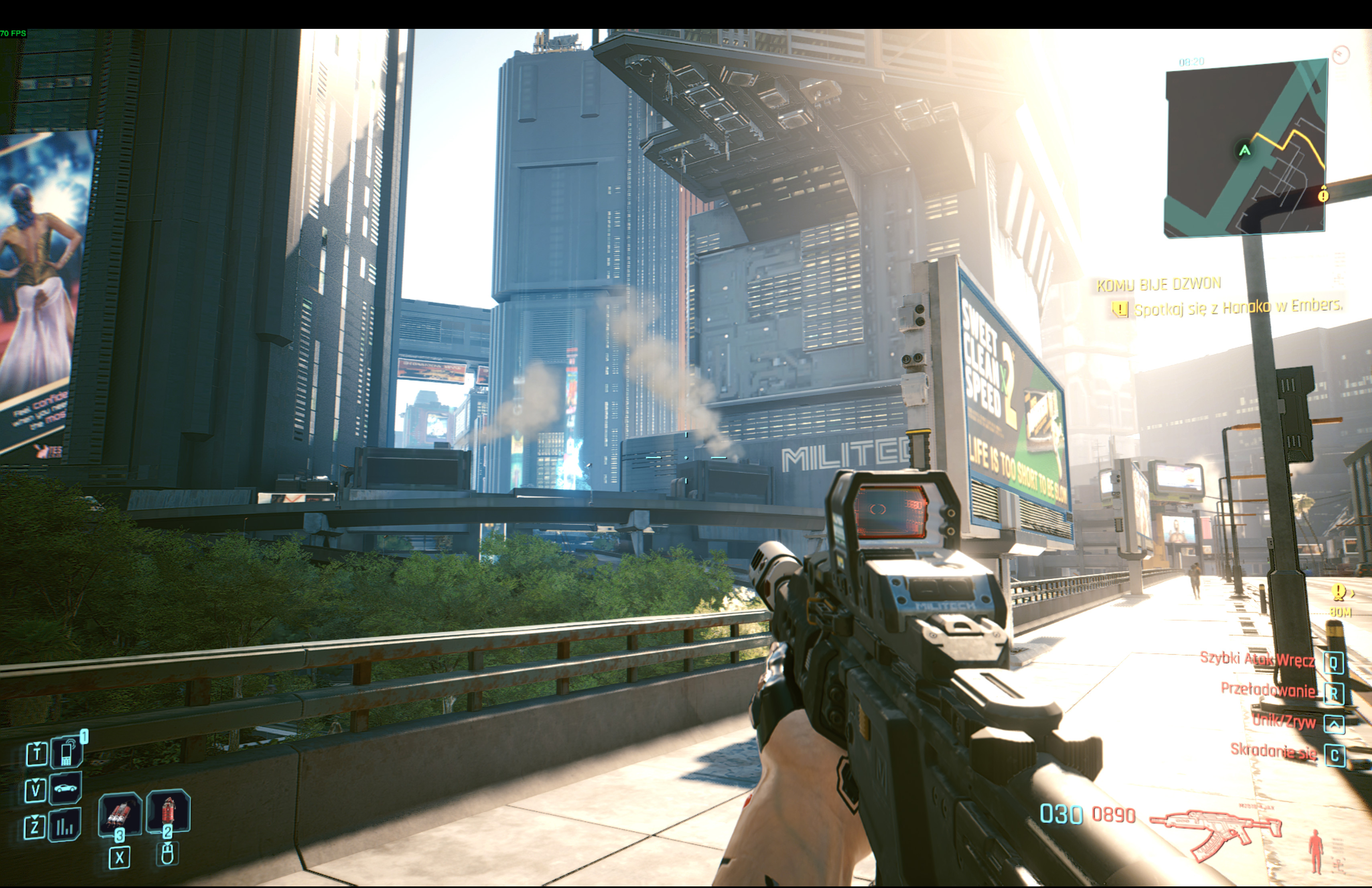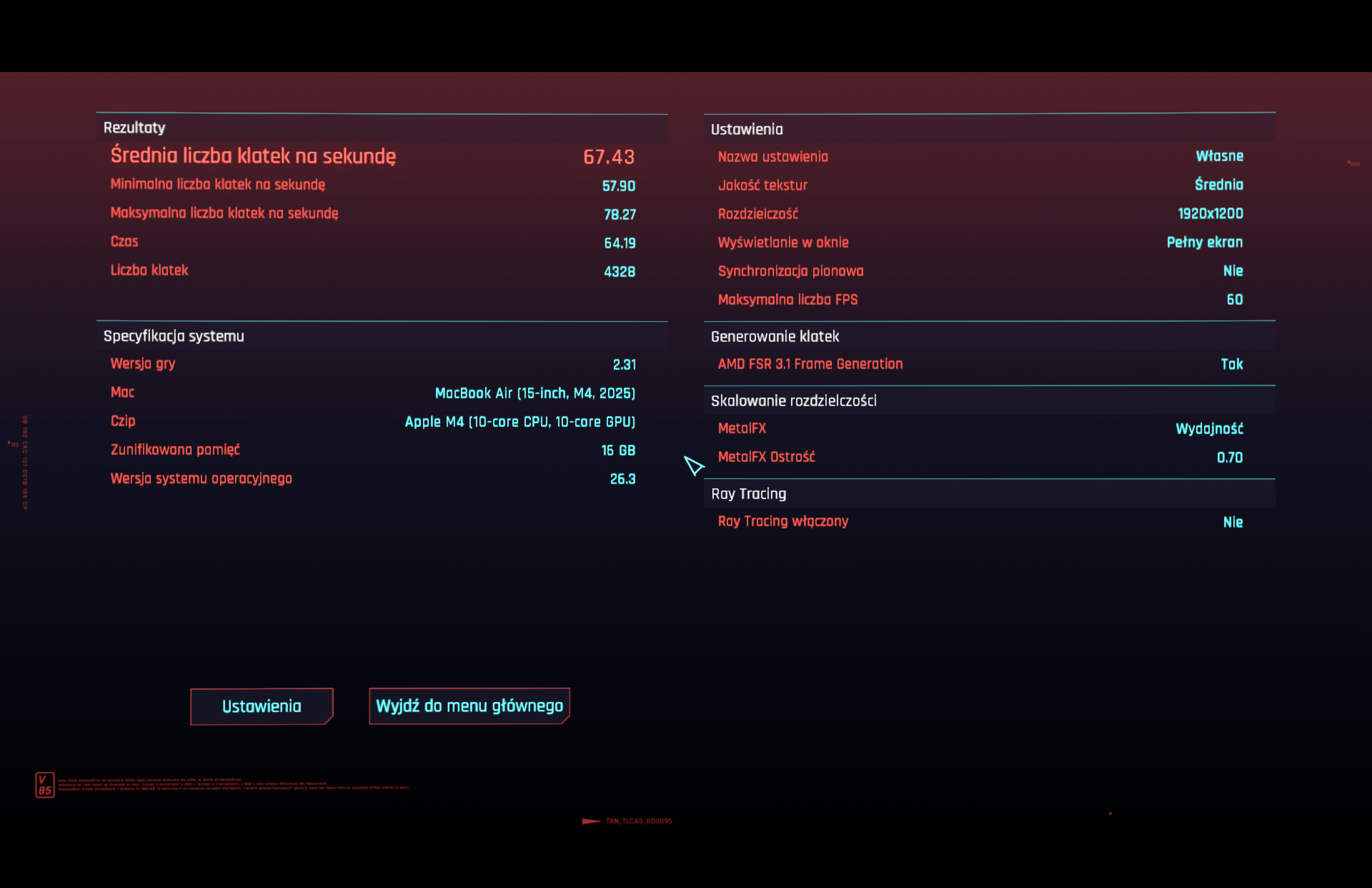 Ile prograłem? Z godzinkę. Dosyć krótko. Wystarczająco jednak aby wyrobić sobie jakąś tam opinię. Krótko mówiąc jest w porządku. Jest to w zasadzie taka sama gra jak na PC. Bardziej interesujące mogą tu być jednak cyferki jakie gra wyciąga. Grałem na średnich ustawieniach graficznych. Najpierw wybrałem rozdzielczość natywną dla monitora czyli 2880x1800 pikseli. Gra wyciągała wtedy jakieś niecałe 30 FPS. Czyli bez szału. Włączenie generowania klatek przez FSR podbiło do okolic 30 klatek na sekundę. Więc wtedy obniżyłem dość wysoką rozdzielczość do 1920x1200 pikseli. Zostawiając włączone generowanie klatek i skalowanie rozdzielczości (eksluzywnie na Macu przez Apple'owe API metal) dobiłem do okolic 60 klatek na sekundę. W praktyce grając w Dogtown gra trzymała okolice 60 FPS w zamkniętych pomieszczeniach, spadając do 50 na zewnątrz. Jednak spora ilość przeciwników na ekranie potrafiła drastycznie to obniżyć do okolic poniżej 30stu.